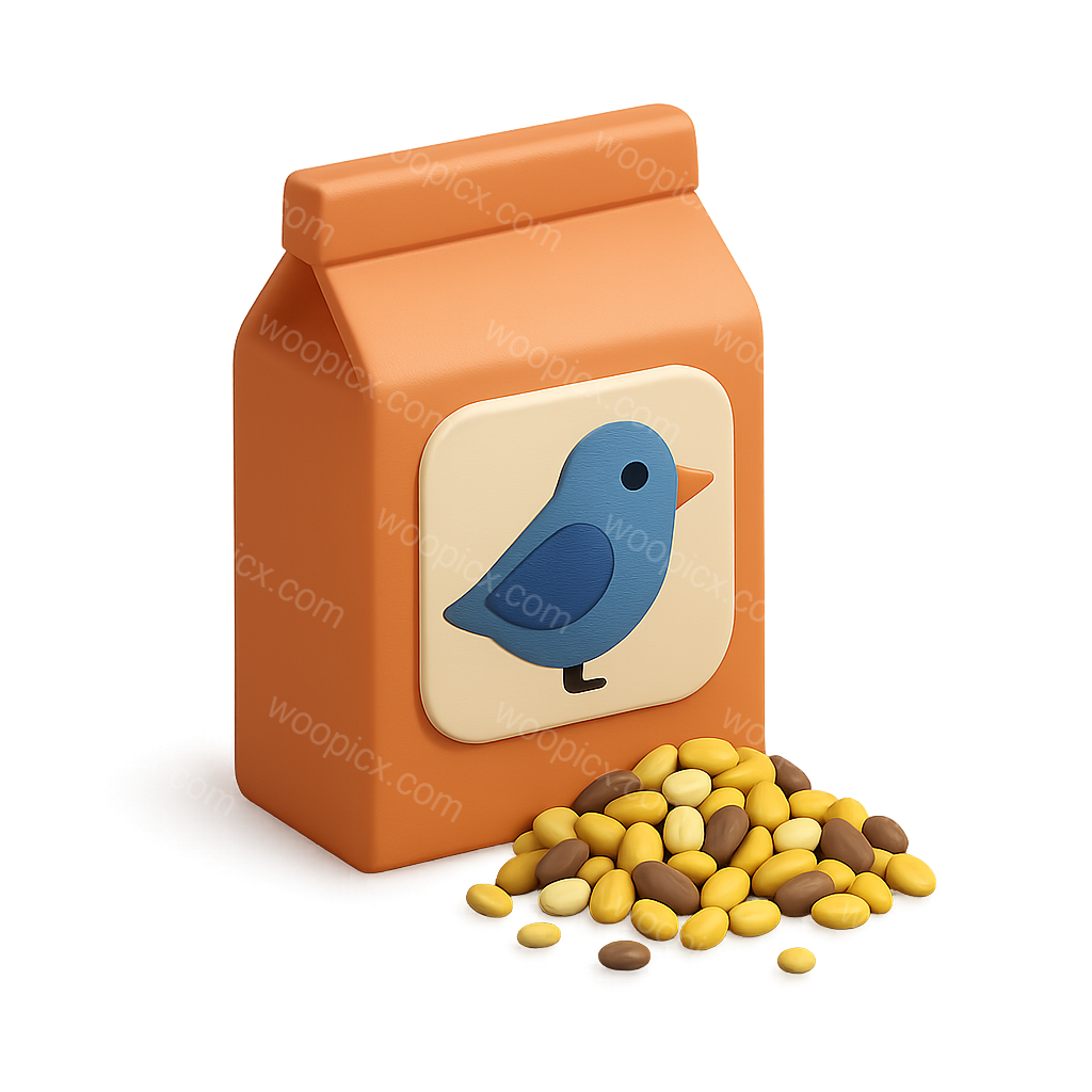 A 3D representation of a bird seed package in an isometric view, featuring a cartoon bird logo. Colorful seeds are scattered around the package, creating a vibrant scene.