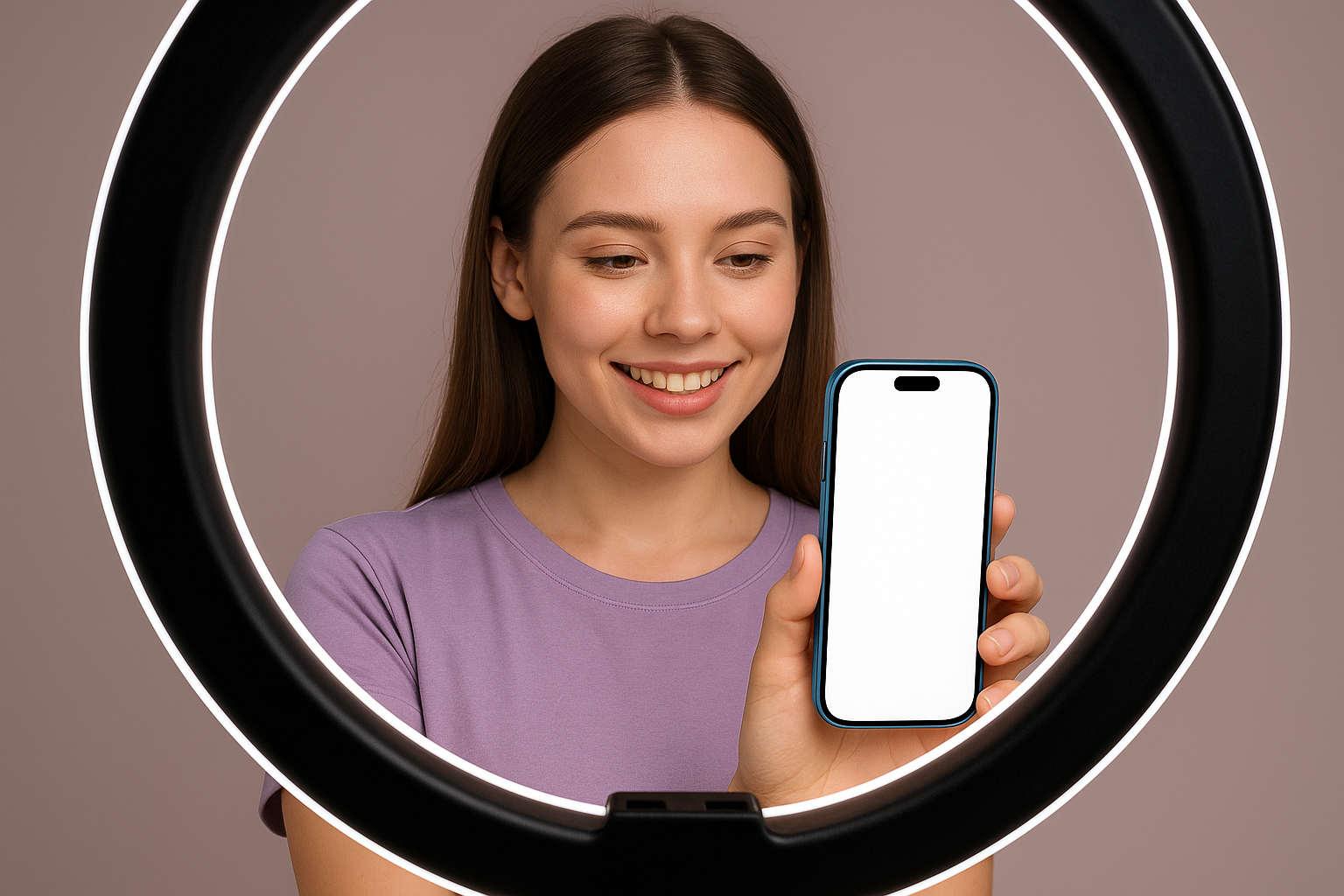 A female blogger is smiling while holding a blue phone within a ring light. The phone features a white screen with rounded corners, enhancing the aesthetic of her content creation.