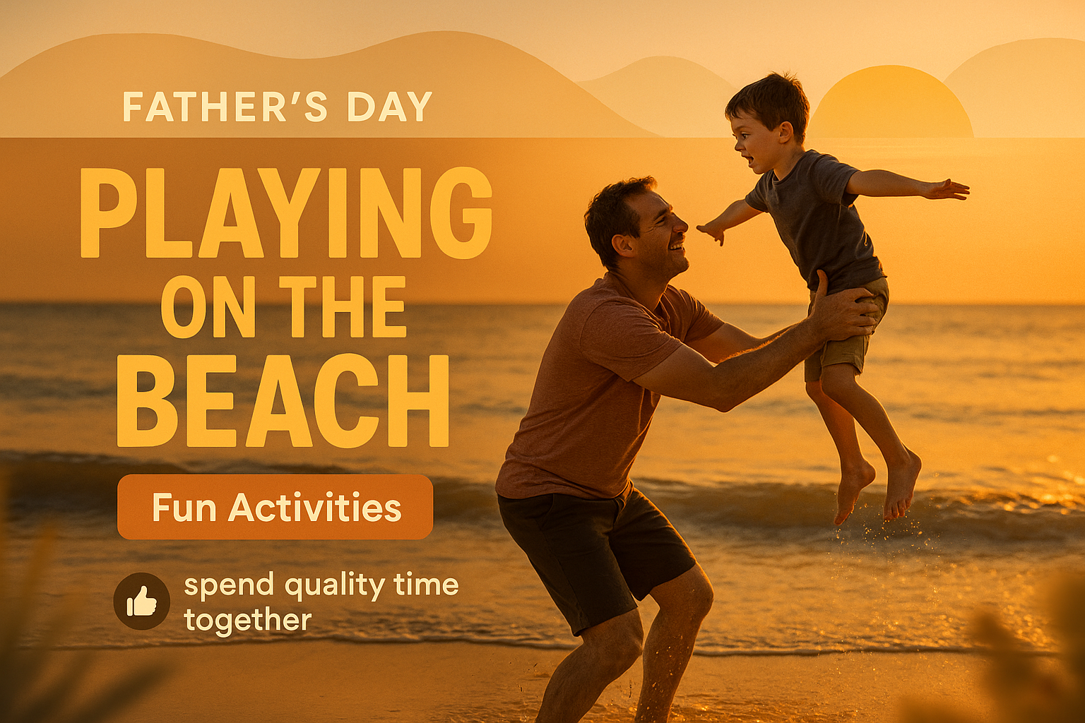 /Collection: /by davooda/Type: PNG/Vibrant promotional graphic showcasing a father and son playing on the beach, ideal for Father's Day activities. The warm colors and inviting visuals enhance the family-friendly theme.