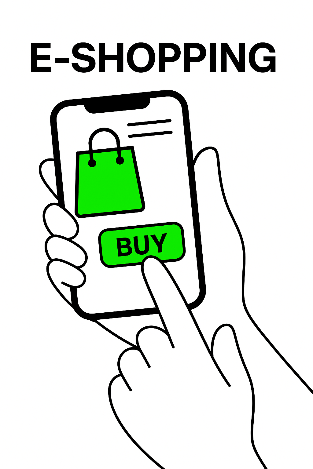Minimalist illustration depicting a smartphone with a shopping cart icon and a 'BUY' button, ideal for e-commerce and digital shopping themes.