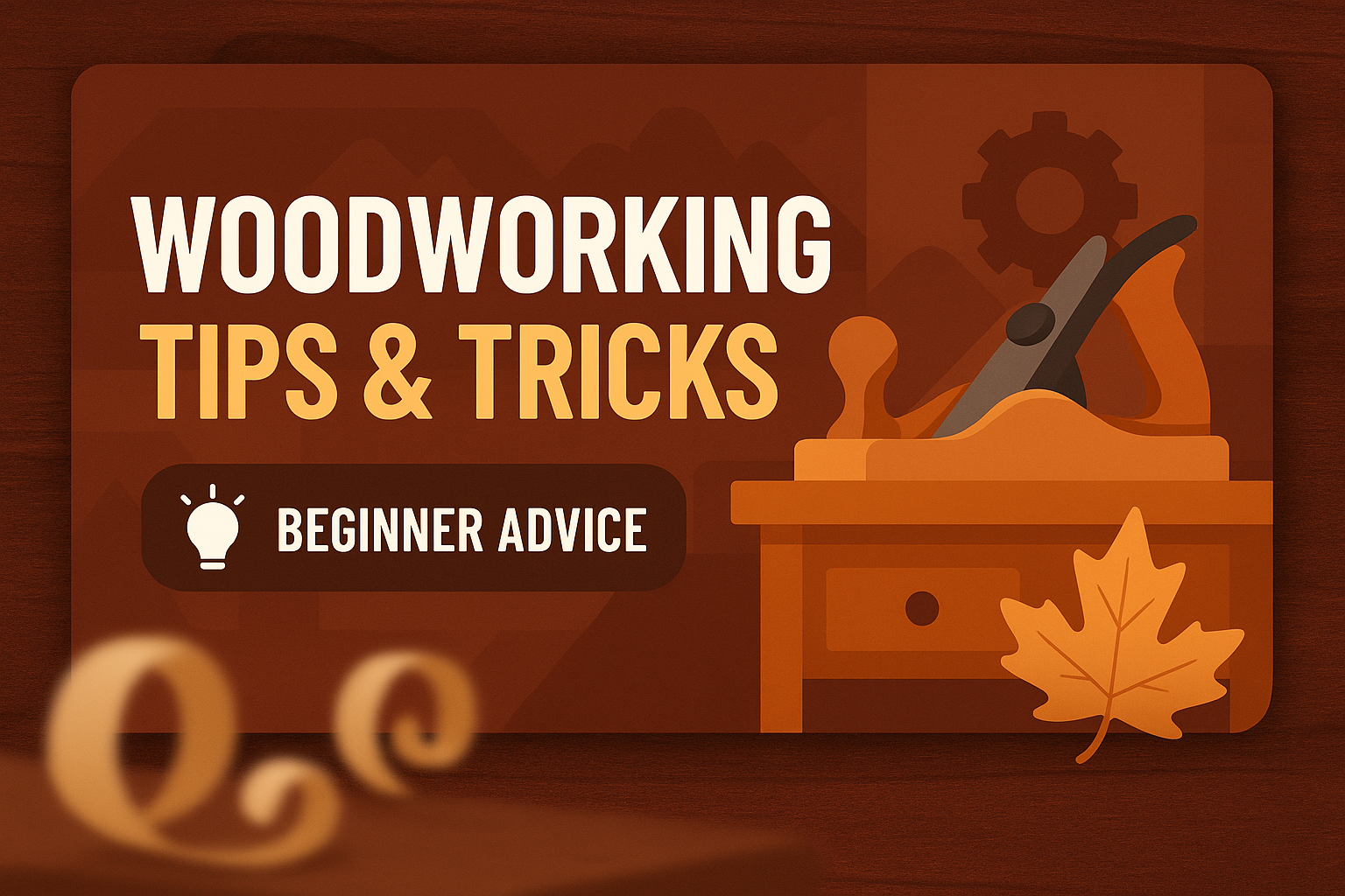 Informative banner graphic featuring woodworking tips for beginners, designed with warm colors and illustrations of tools and leaves, ideal for DIY enthusiasts.