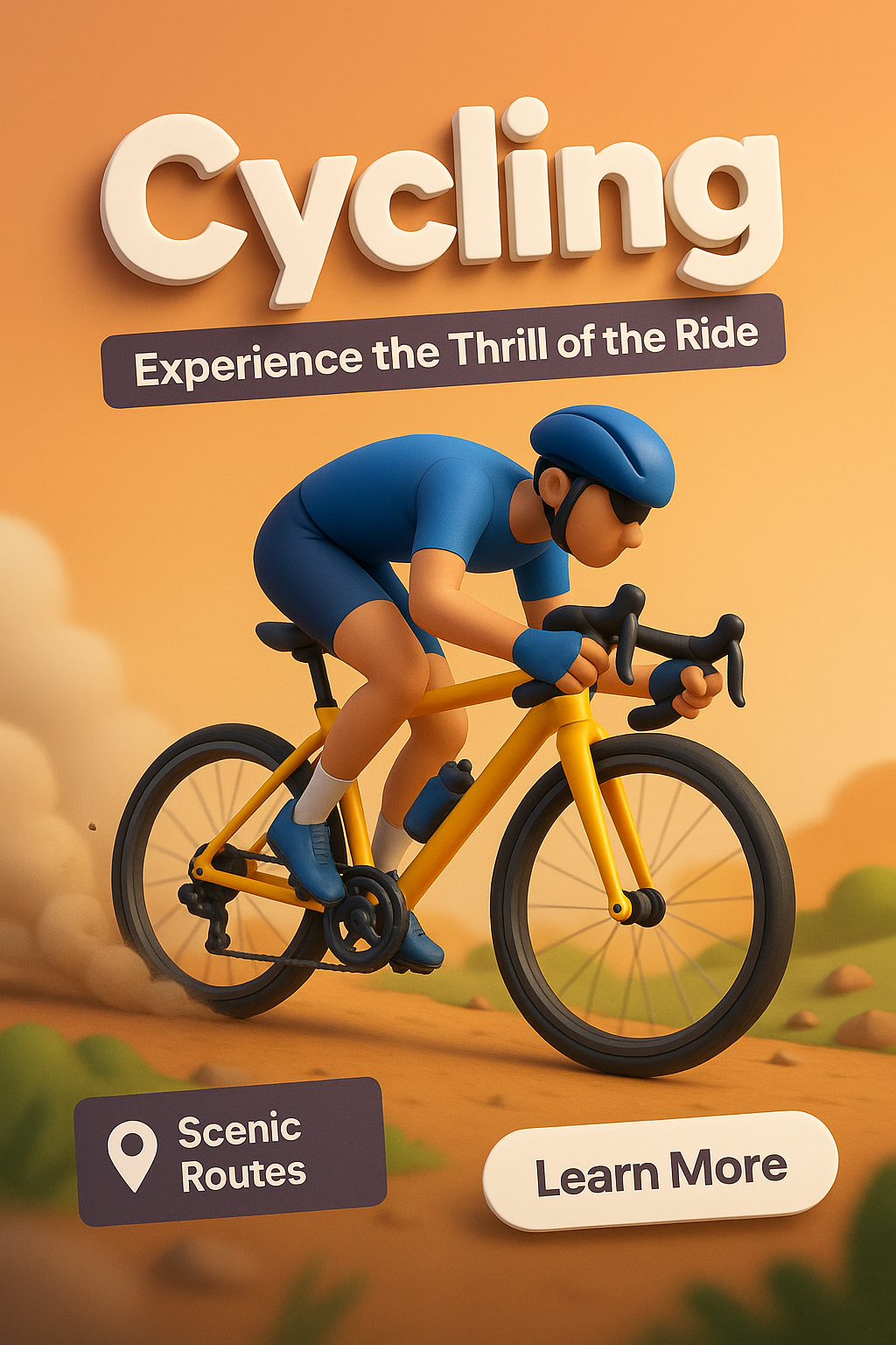 This is a vibrant digital illustration promoting cycling experiences. It features a cyclist in motion, set against a warm background. Ideal for social media or promotional use.