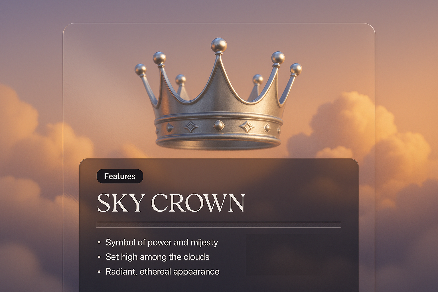 /Collection: /by davooda/Type: PNG/A captivating 3D illustration of a sky crown, symbolizing power and majesty, set against a dreamy cloud backdrop. Features a sleek dark panel with elegant text.