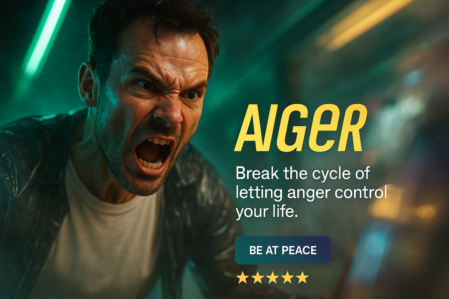 A striking carousel slide design featuring a fierce expression symbolizing anger, with neon accents and a focus on breaking the cycle of anger control. The scene is vibrant and engaging.
