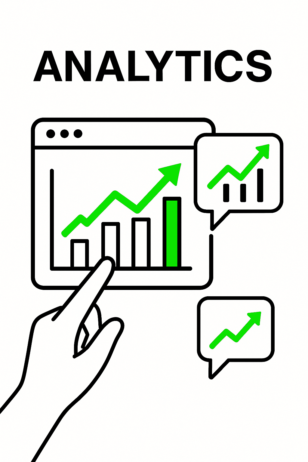 /Collection: /by davooda/Type: PNG/A modern illustration depicting analytics with a hand pointing at a graph showing upward trends, complemented by speech bubbles. Ideal for digital marketing and data analysis presentations.