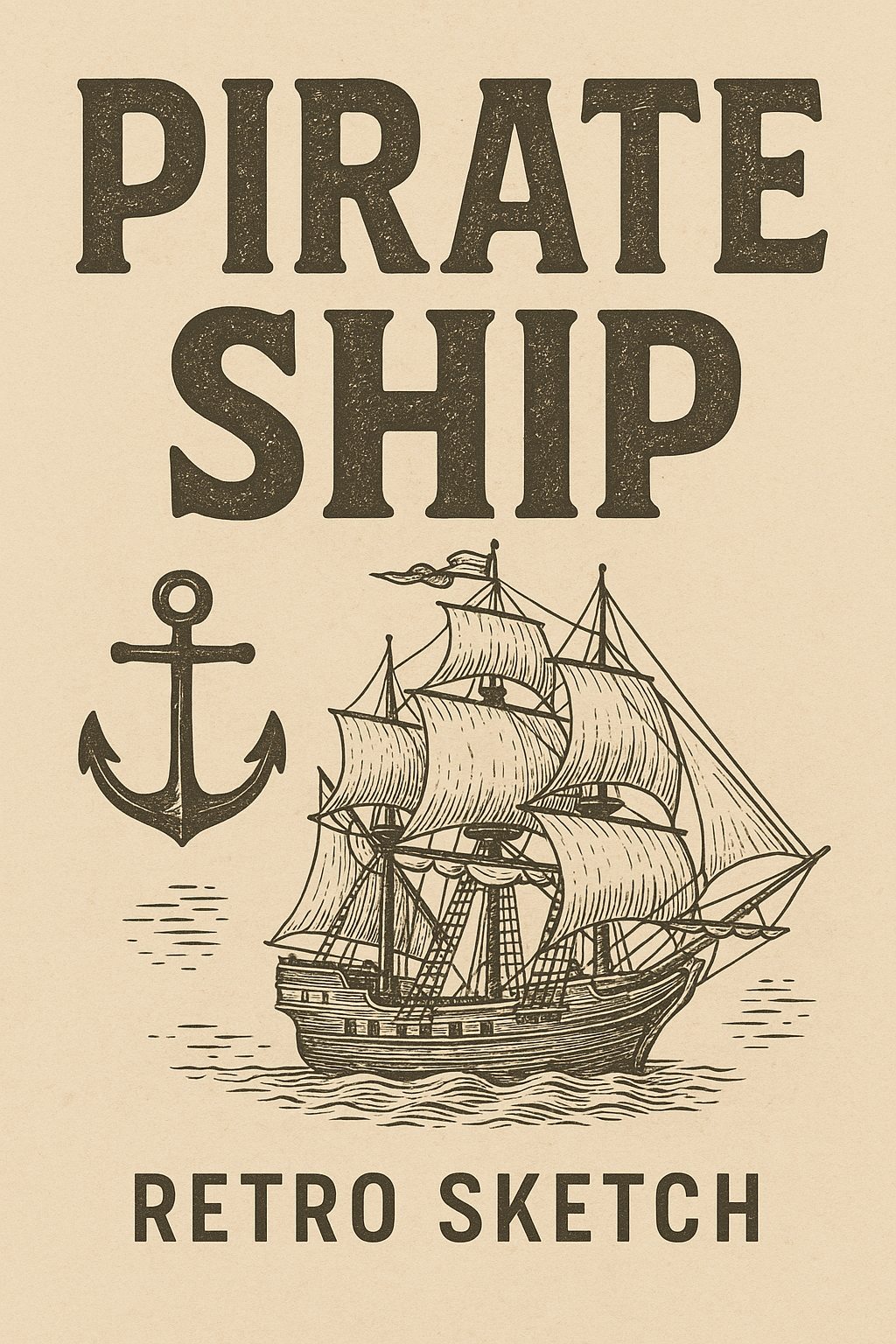 A retro-themed illustration featuring a detailed pirate ship and anchor design, perfect for nautical-themed projects or vintage artwork.