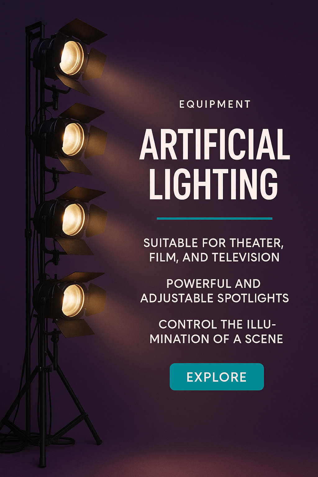 /Collection: /by davooda/Type: PNG/Modern promotional image featuring lighting equipment for theater, film, and television. The design emphasizes adjustable spotlights with a sleek, professional aesthetic.