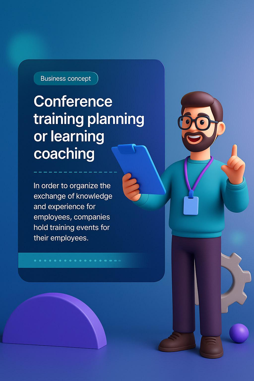 /Collection: /by davooda/Type: PNG/A vibrant 3D illustration depicting a business coaching theme. Features a character holding a tablet, emphasizing learning and training concepts. The background blends smoothly with a simple gradient.