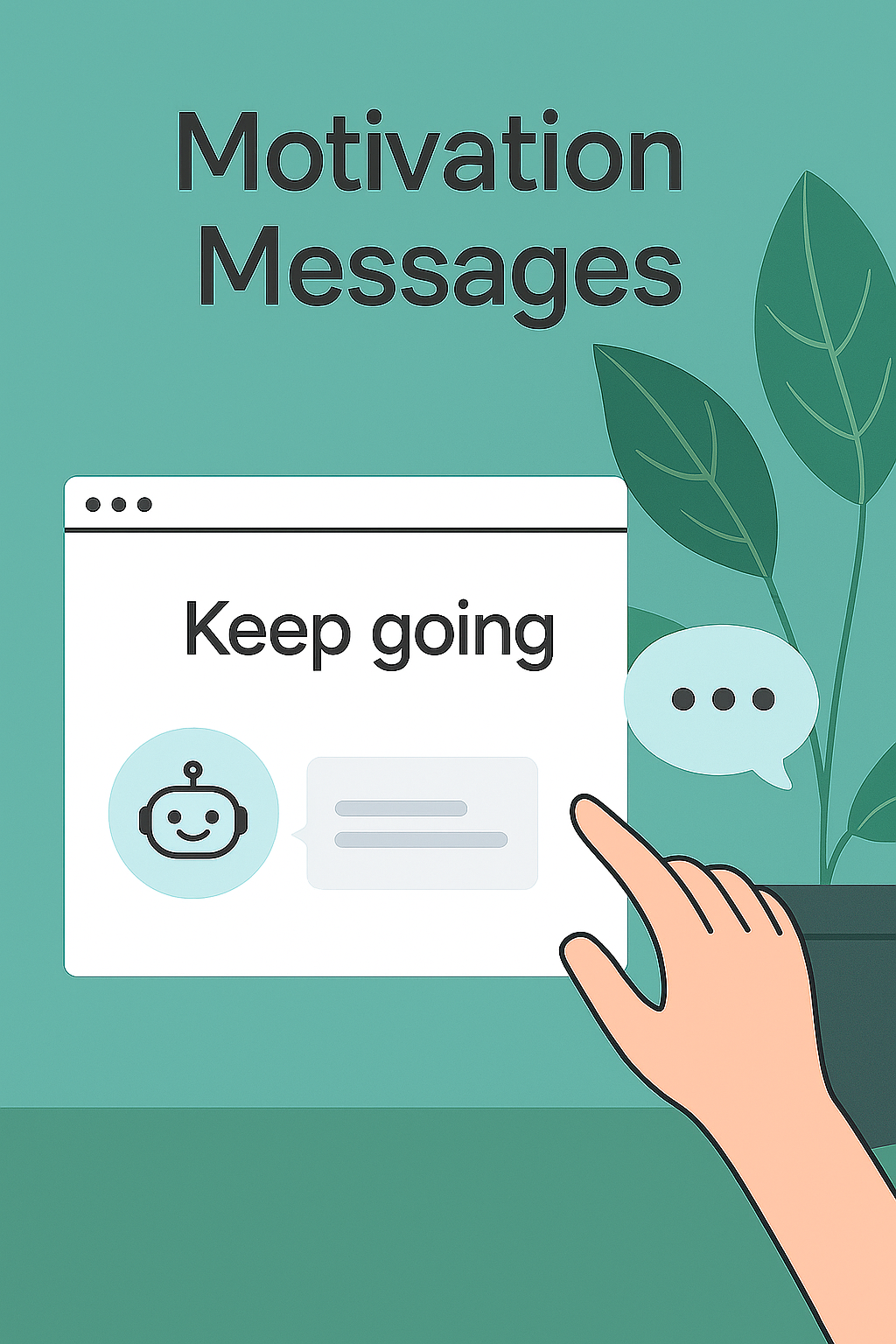 A visually appealing graphic illustrating motivational messages with a hand reaching towards a chat interface. Ideal for social media or motivational content.