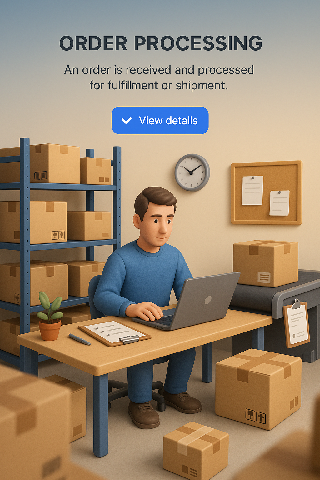 /Collection: /by davooda/Type: PNG/A realistic 3D illustration depicting a workspace focused on order processing. It features a person at a desk with a laptop, surrounded by boxes and storage shelves, creating a cohesive and engaging visual.