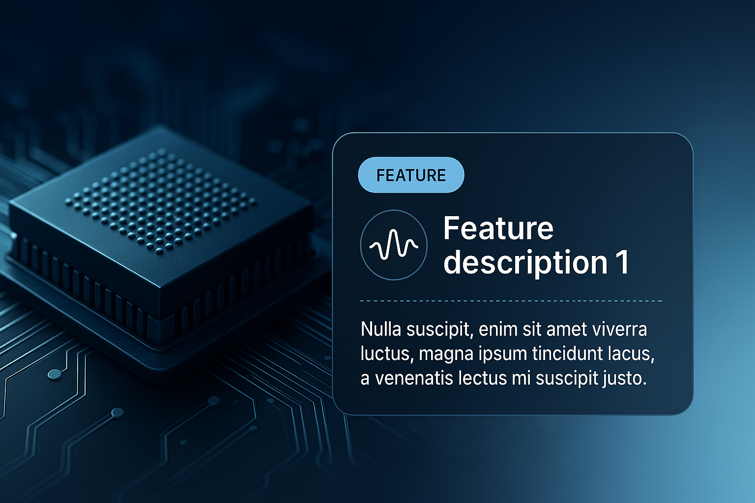 /Collection: /by davooda/Type: PNG/A close-up of a microchip on a gradient background, featuring a text block that highlights a specific feature with dynamic visual elements. The design emphasizes technological sophistication.