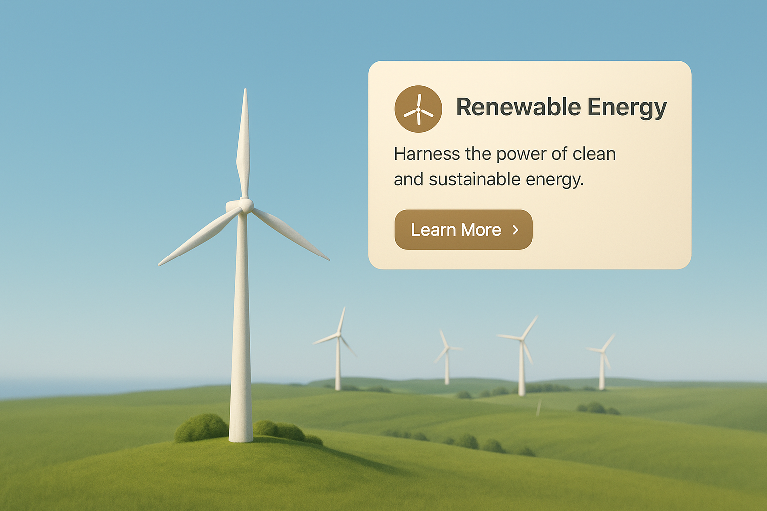 /Collection: /by davooda/Type: PNG/A stunning depiction of a wind farm set in a lush green landscape, featuring elegant turbines against a clear blue sky. The scene emphasizes renewable energy.