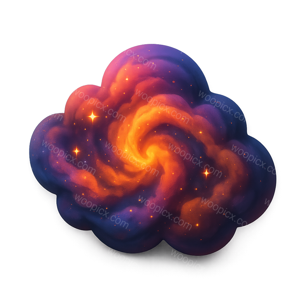 A vibrant 3D nebula cloud icon depicted in a three-quarter view, featuring swirling colors of purple, orange, and hints of stars, set against a transparent background.