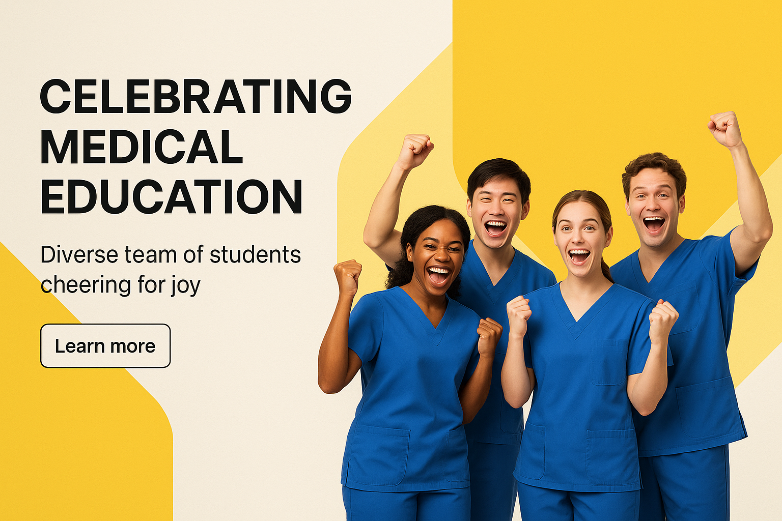 /Collection: /by davooda/Type: PNG/A joyful group of diverse nursing students in scrubs celebrates medical education. The modern design features bold typography and a bright geometric background.