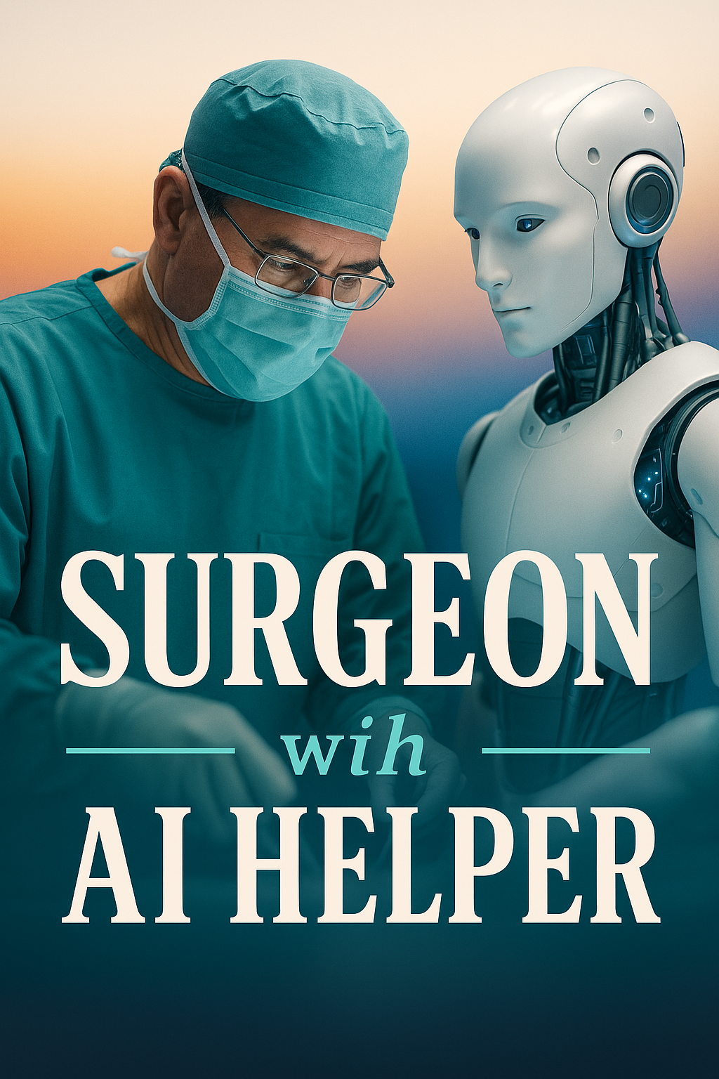 /Collection: /by davooda/Type: PNG/A surgeon in scrubs and a mask is working alongside a humanoid AI assistant. The background features a gradient from white to dark, enhancing the focus on their collaboration.