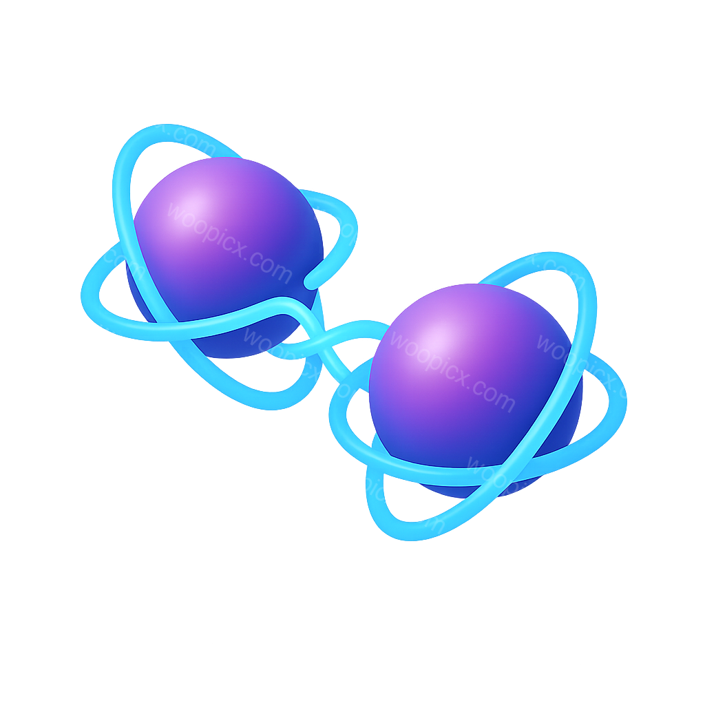 A vibrant 3D icon representing quantum entanglement, featuring two purple spheres connected by a glowing blue loop. The isometric design enhances the visual depth.