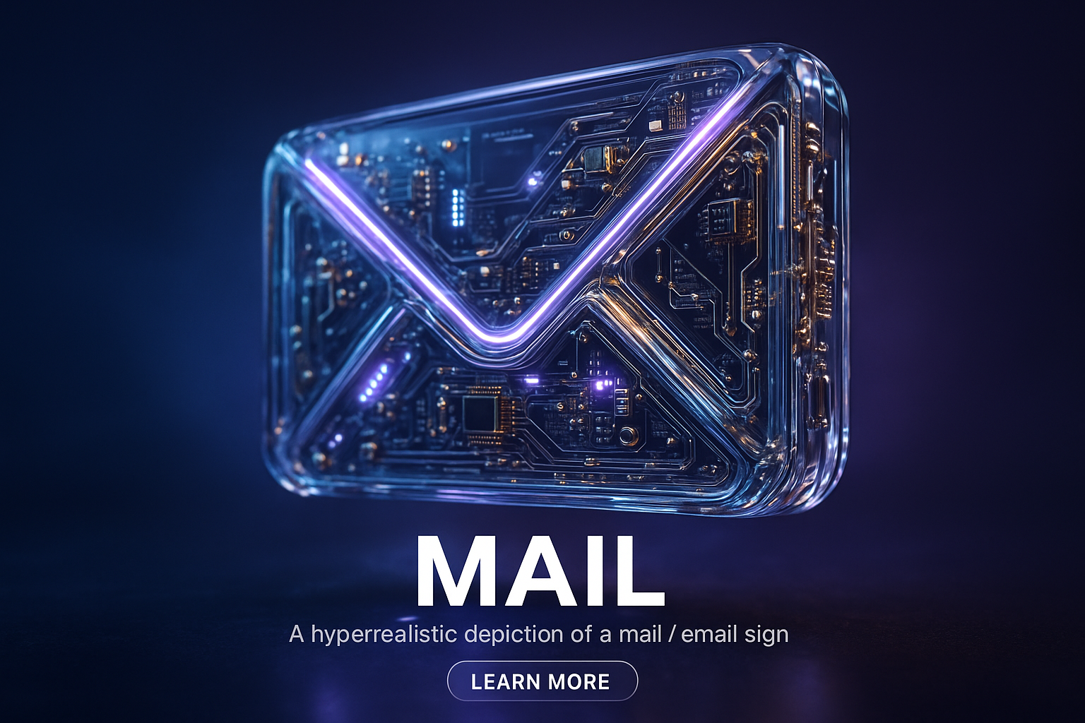A stunning hyperrealistic 3D depiction of a mail sign, featuring intricate glowing micro-LEDs and metallic components within a crystalline structure, illuminated by neon lights.