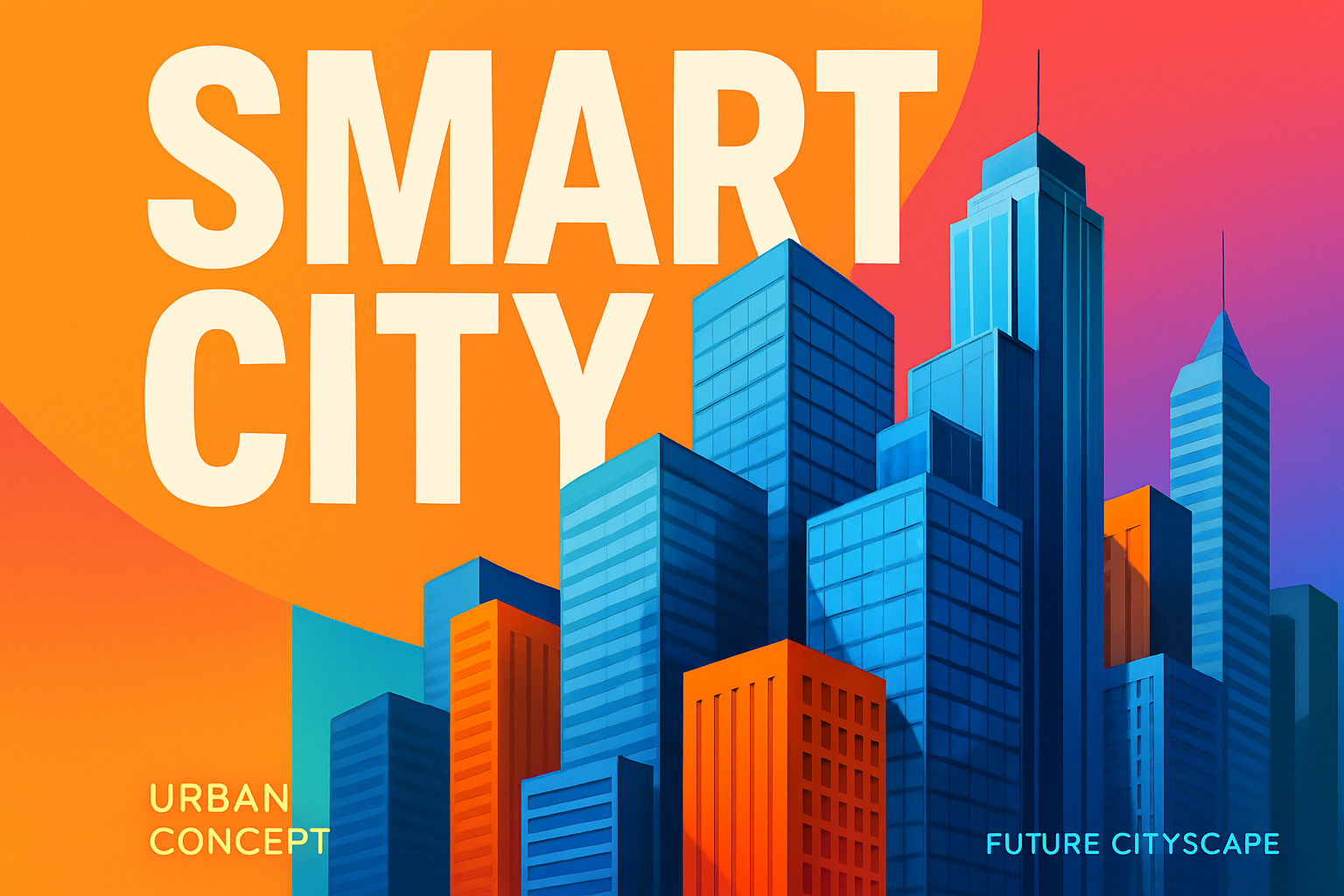 /Collection: /by davooda/Type: PNG/An abstract representation of a vibrant urban skyline featuring skyscrapers in bold colors. The image showcases the concept of a smart city with oversized text elements that create an energetic and modern atmosphere.