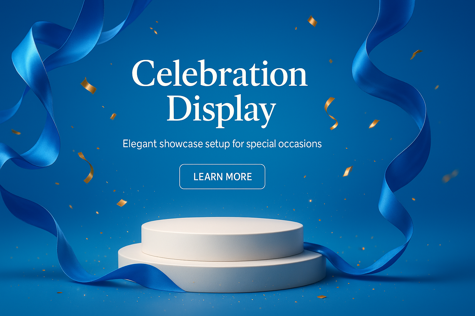 This is a promotional graphic featuring a minimalist pedestal surrounded by blue ribbons and confetti. Ideal for event showcases or product displays.