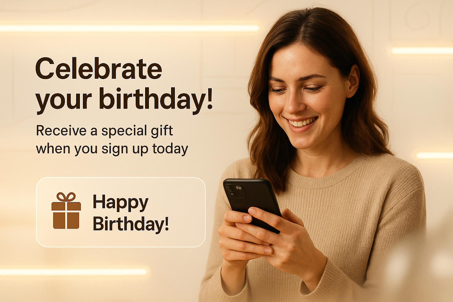 /Collection: /by davooda/Type: PNG/A vibrant promotional image celebrating birthdays, showcasing a smiling individual using a smartphone. Ideal for social media marketing aimed at attracting new sign-ups.