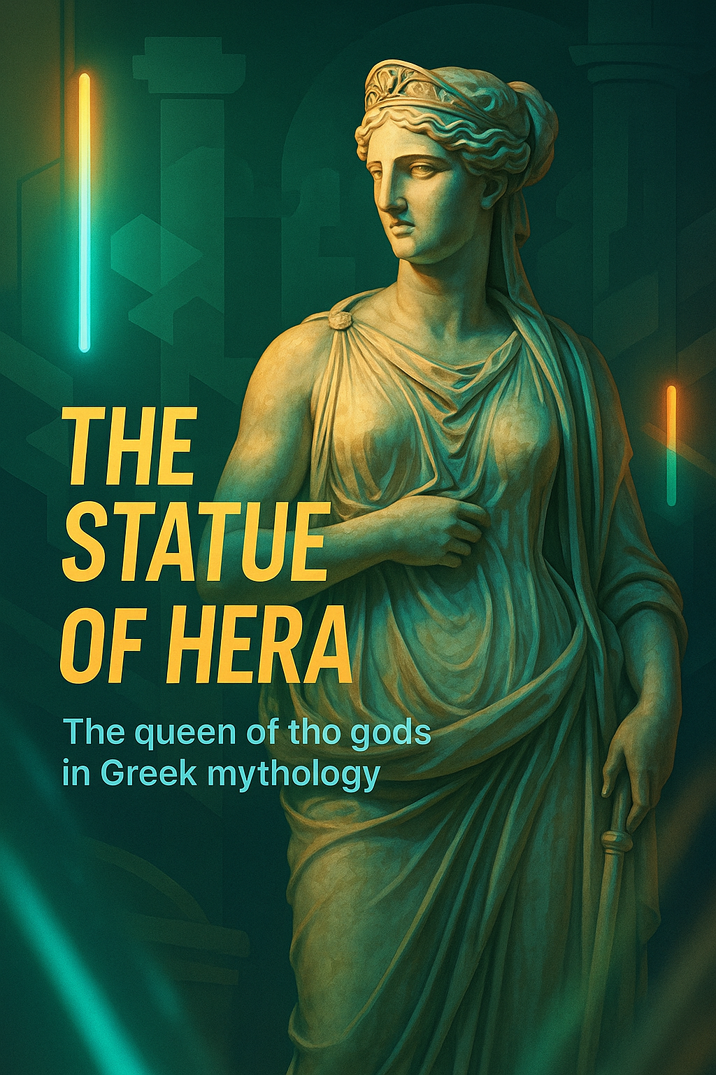 A striking digital representation of the Statue of Hera, showcasing classical design elements and modern visual effects, ideal for mythology-themed content.