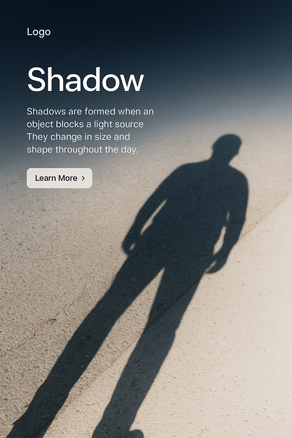 A sleek web design showcasing a shadow as the focal point, featuring a logo, a brief title, a text block, and a 'Learn More' button. The background transitions from dark to white.