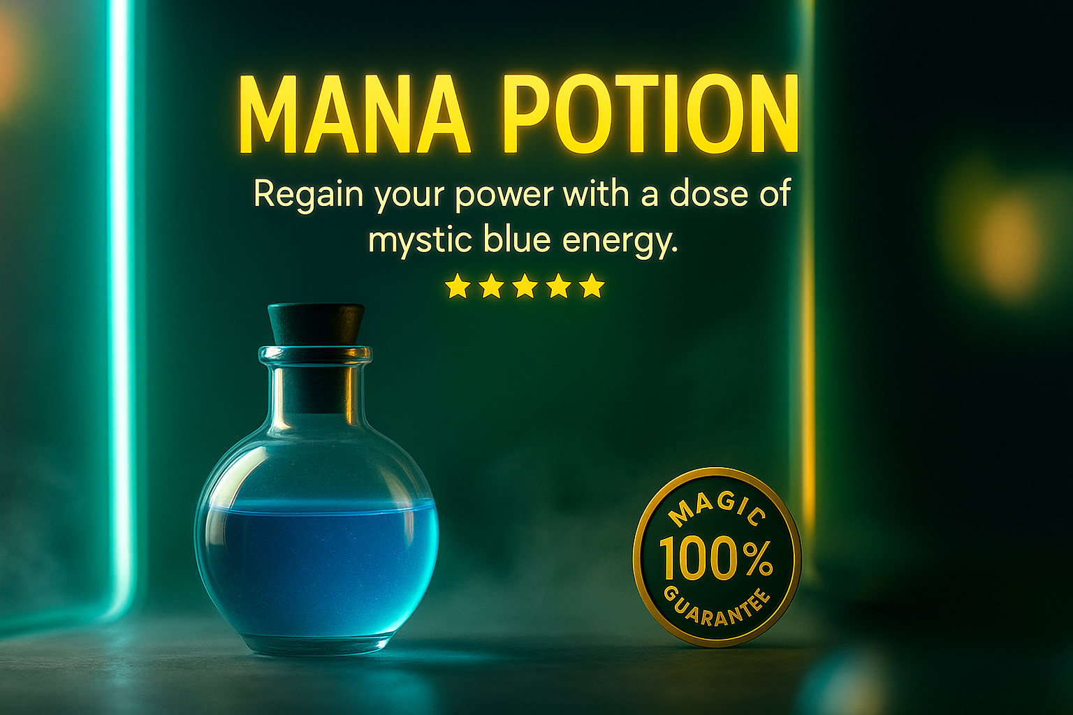 A captivating design featuring a glowing mana potion bottle, set against a vibrant neon backdrop. The text highlights the potion's mystical properties with a guarantee badge.