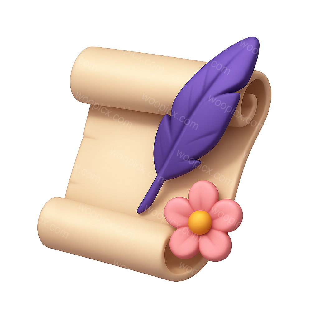 /Premium/Collection: /by davooda/Type: PNG/An artistic 3D scroll featuring a purple feather and a pink flower, presented in a three-quarter isometric view. The design captures a whimsical and colorful essence.