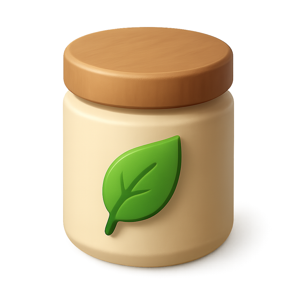 A 3D icon of a jar with a wooden lid, featuring a prominent green leaf design on its surface. The container is depicted in a three-quarter isometric view against a soft gradient background.
