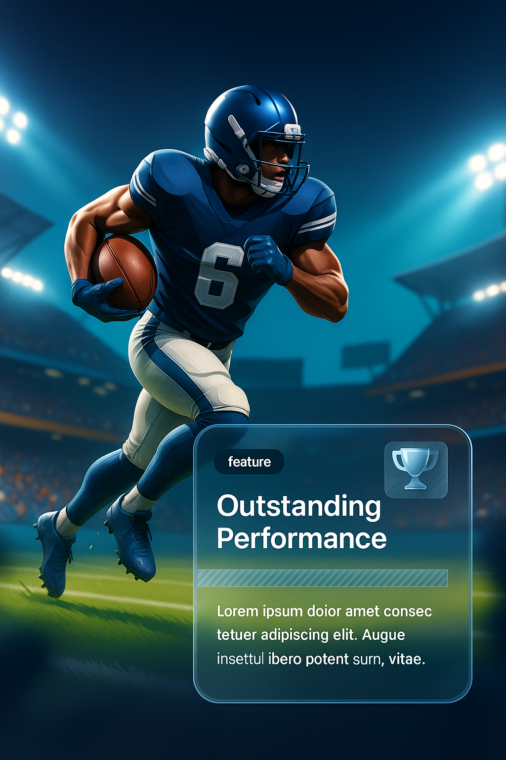 A vibrant 3D illustration showcasing a football player in motion, with a stadium backdrop. The design features a gradient background and a transparent text block highlighting performance.
