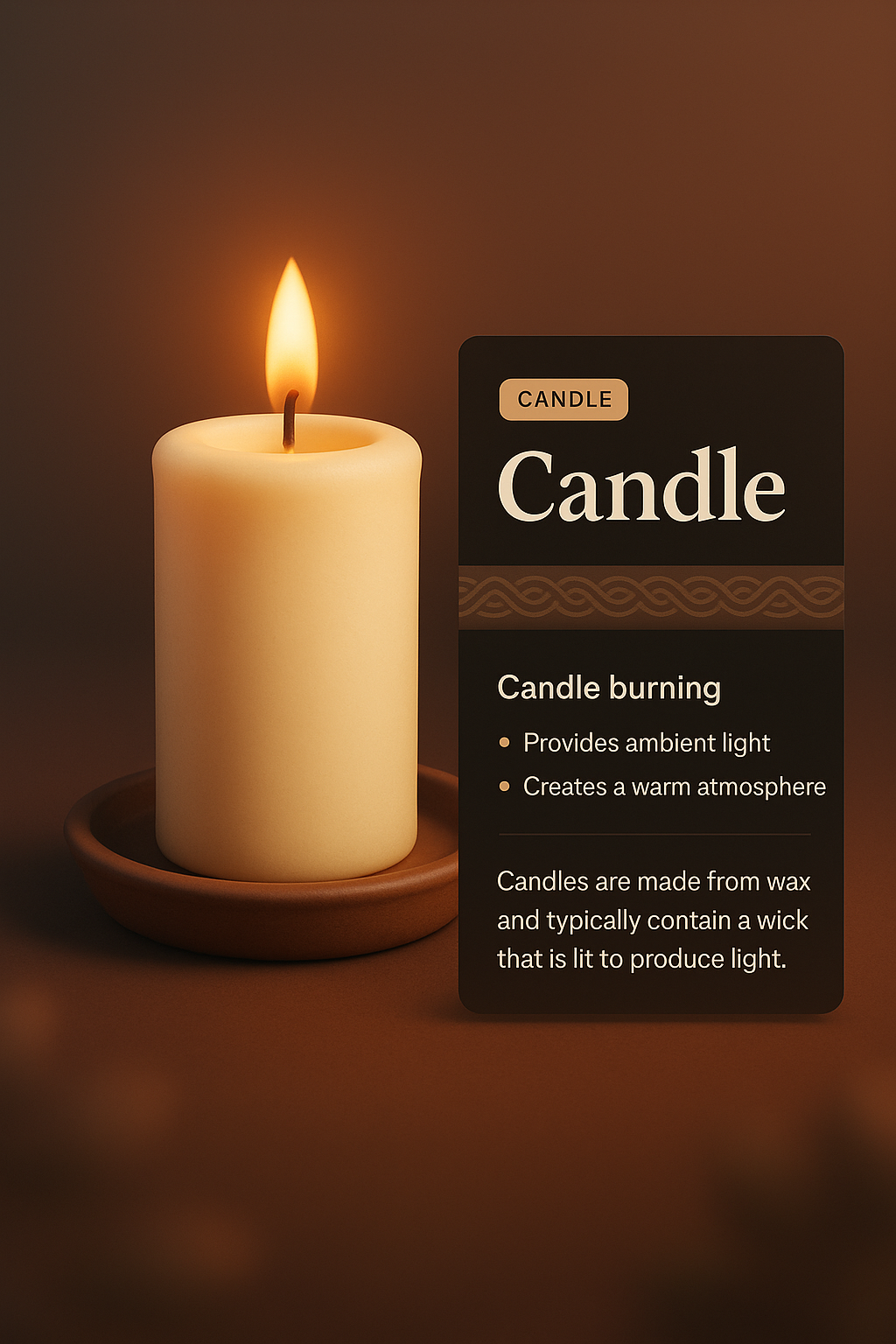 A beautifully designed 3D illustration of a candle burning softly, accompanied by a stylish dark card that provides details about its features and use.