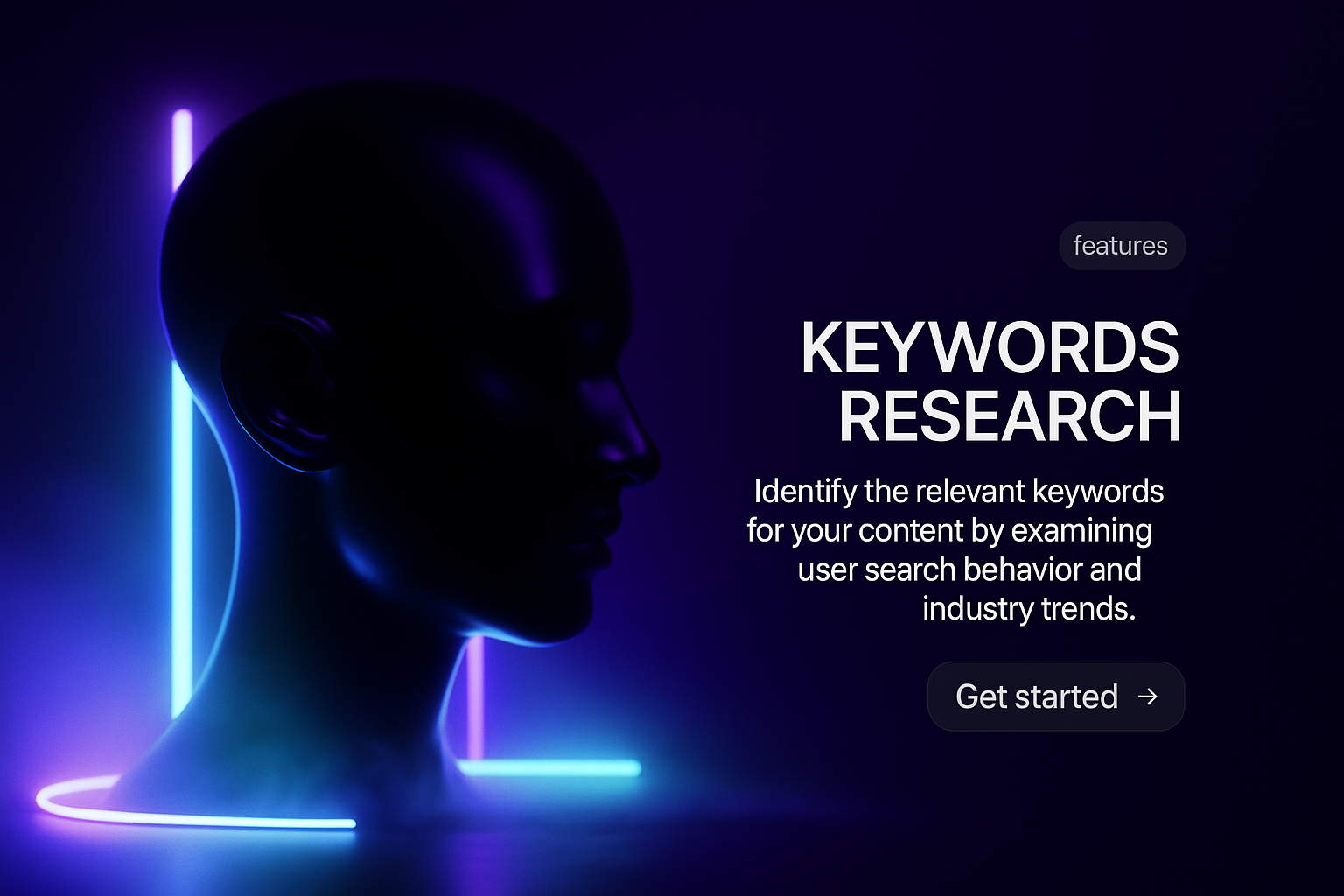 A visually striking neon-themed 3D scene featuring a silhouette with glowing accents. Text elements highlight keywords research, creating a modern and engaging design.