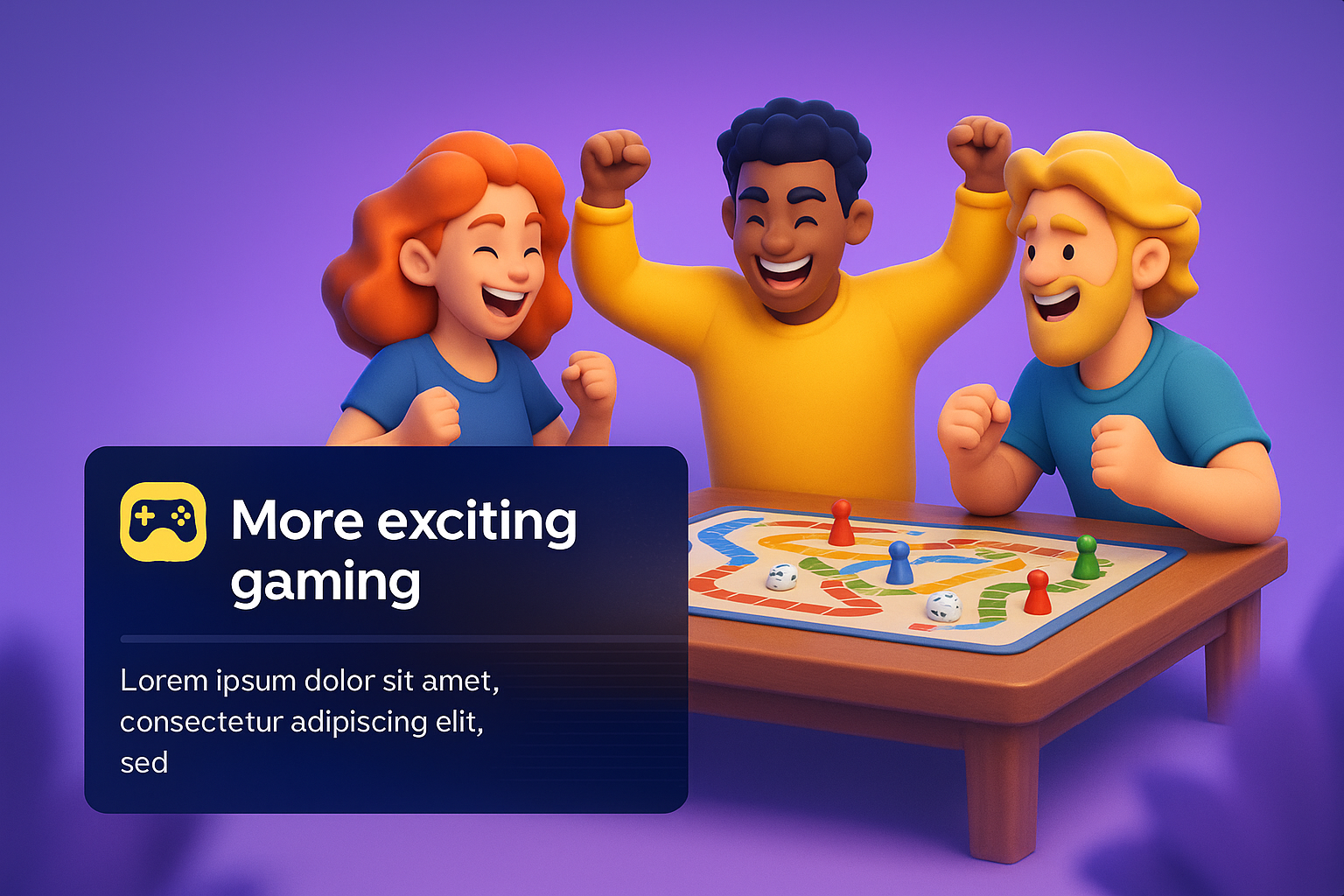 A lively scene of three friends celebrating while playing a board game. The colorful 3D illustration captures their joy and excitement, complemented by a stylish text block.