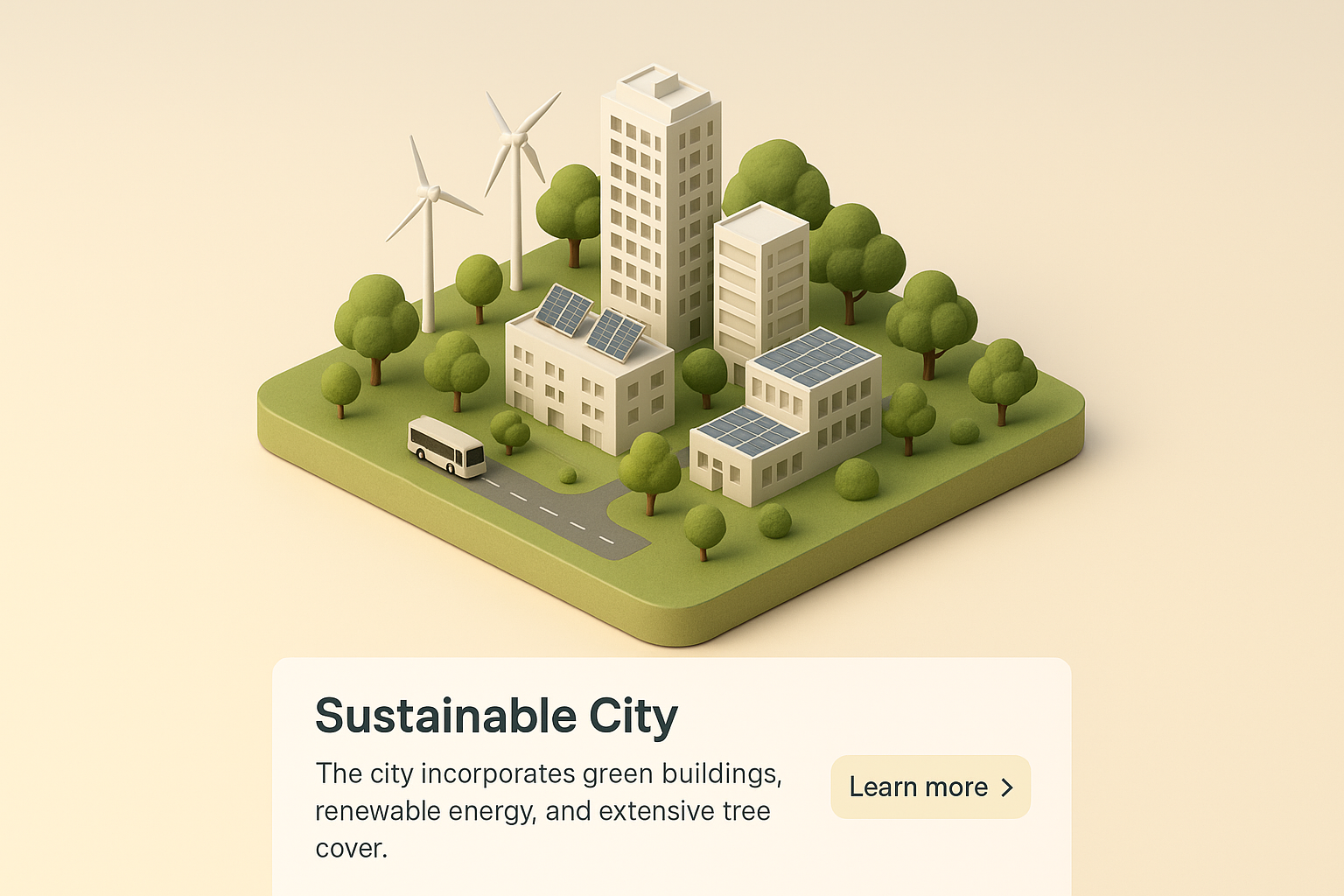 A detailed isometric illustration of a sustainable city featuring green buildings, wind turbines, and trees, set against a light background. The scene emphasizes eco-friendly urban planning.