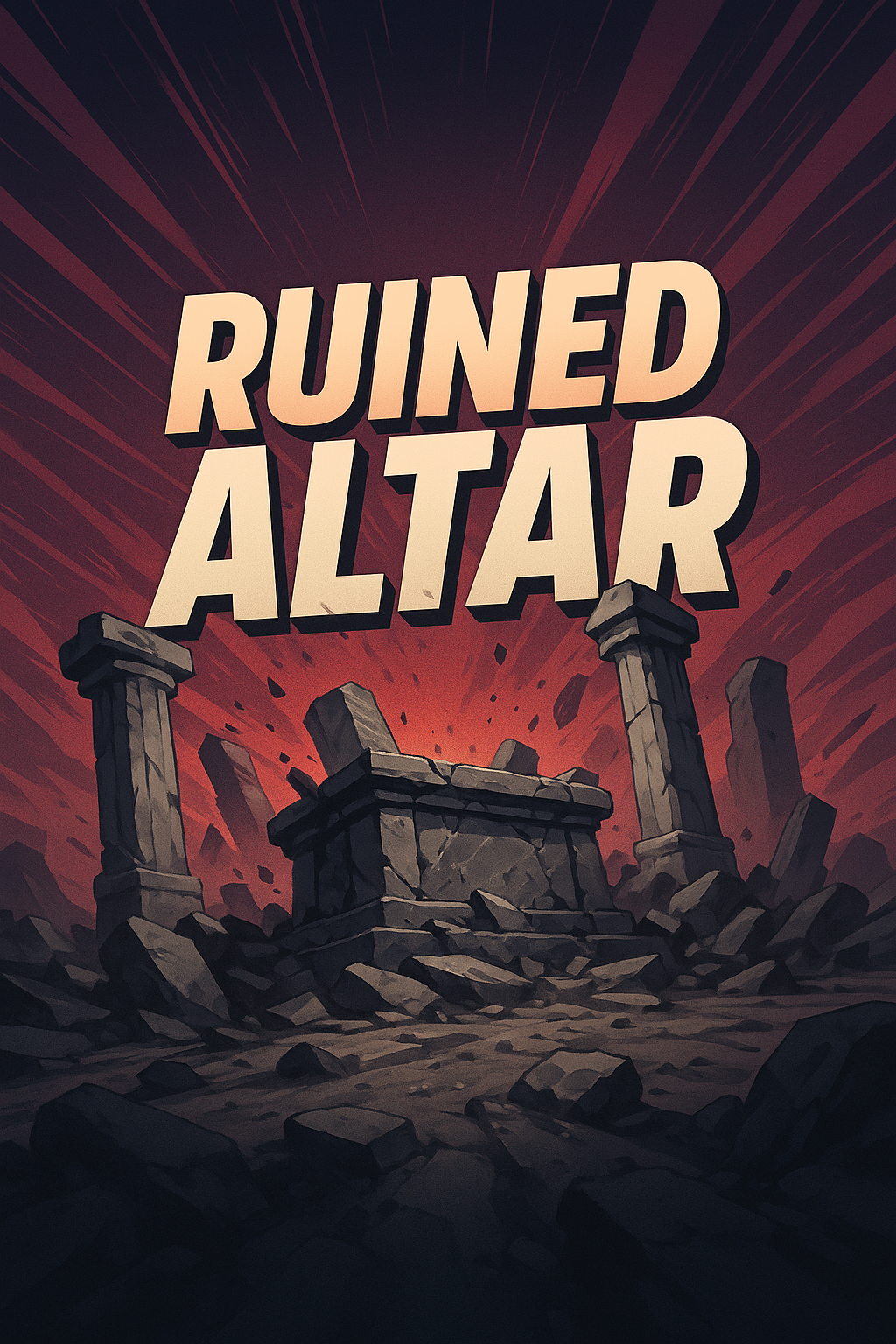 /Collection: /by davooda/Type: PNG/A captivating illustration featuring a ruined altar surrounded by dynamic rays of light. The bold title 'RUINED ALTAR' captures attention against a vibrant gradient background, enhancing the dramatic effect.