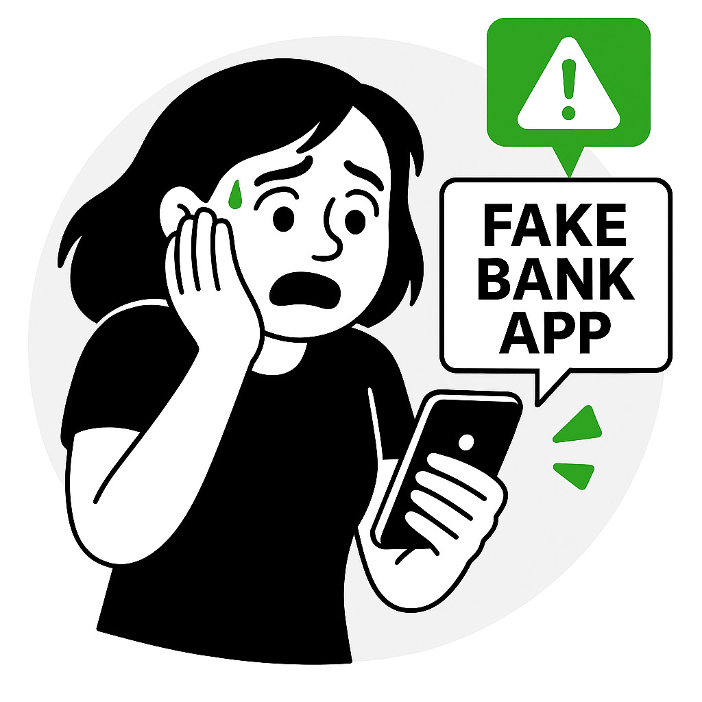 /Collection: /by davooda/Type: PNG/A cautionary graphic illustrating a person expressing concern over a fake bank application on their phone. The design is minimalist with a monochrome palette and bold accents, aimed at raising awareness about digital security.