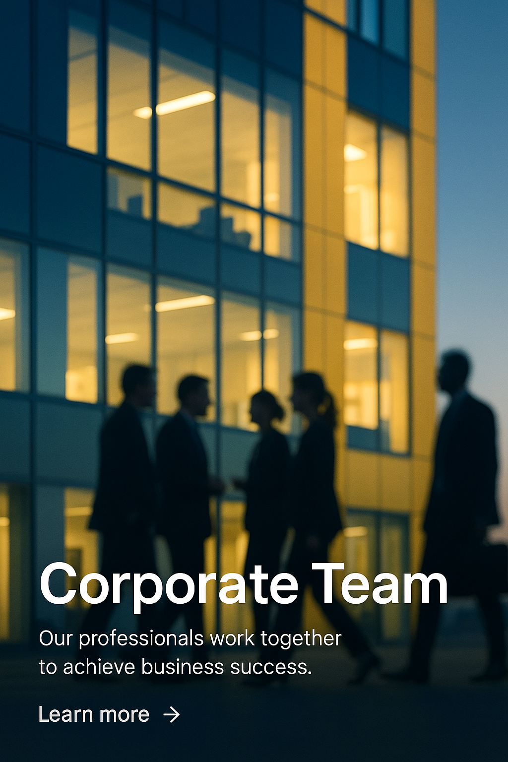 /Collection: /by davooda/Type: PNG/The image showcases blurred silhouettes of office employees interacting outside a modern business building, illuminated with blue and yellow lights. A professional atmosphere is depicted.