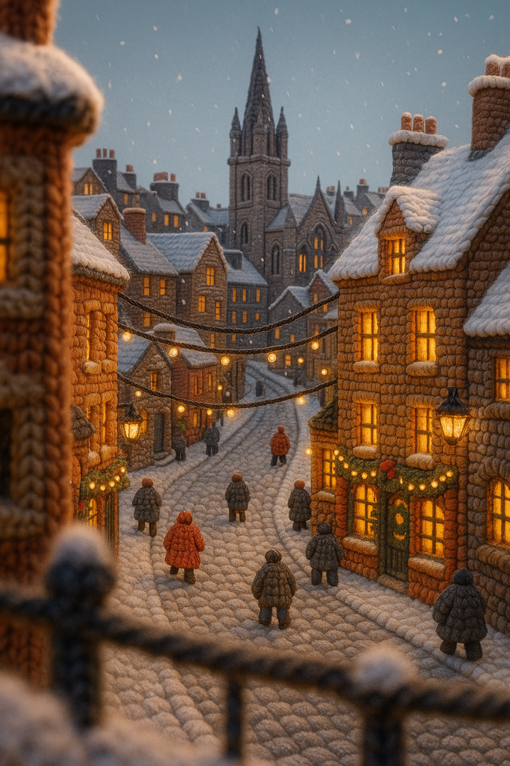 A charming winter scene of Edinburgh's Old Town, crafted from wool-like textures. The image features a snowy street with small figures, warm lights, and a festive atmosphere.