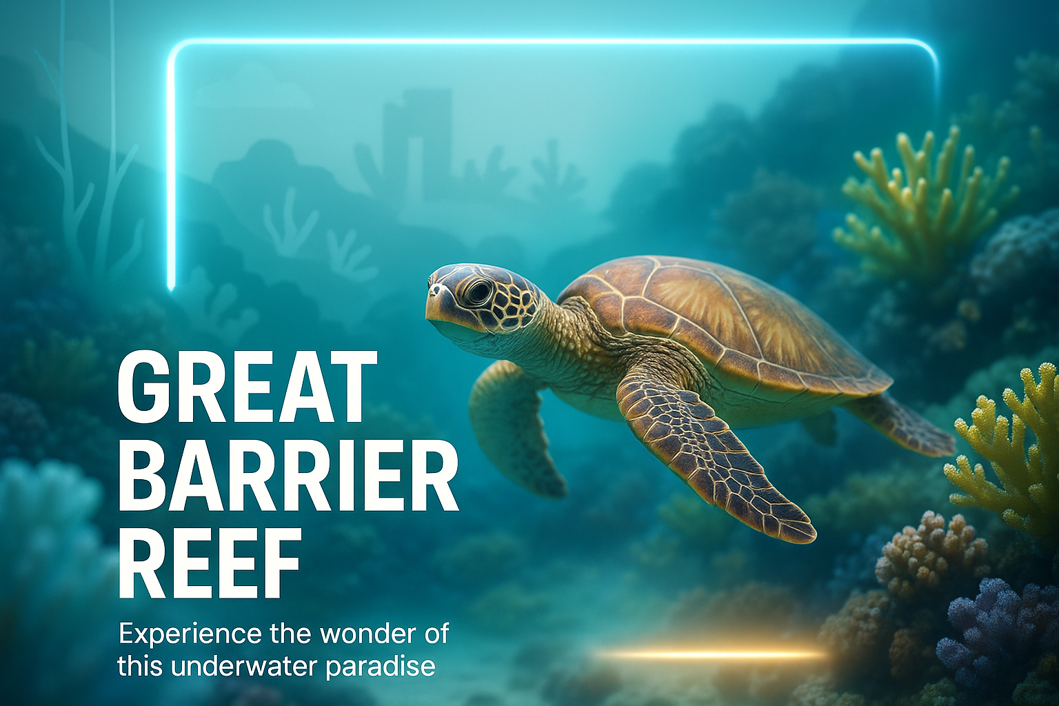 /Collection: /by davooda/Type: PNG/A vibrant underwater graphic showcasing a sea turtle swimming through coral in the Great Barrier Reef, emphasizing marine life and natural beauty, ideal for eco-tourism or conservation campaigns.
