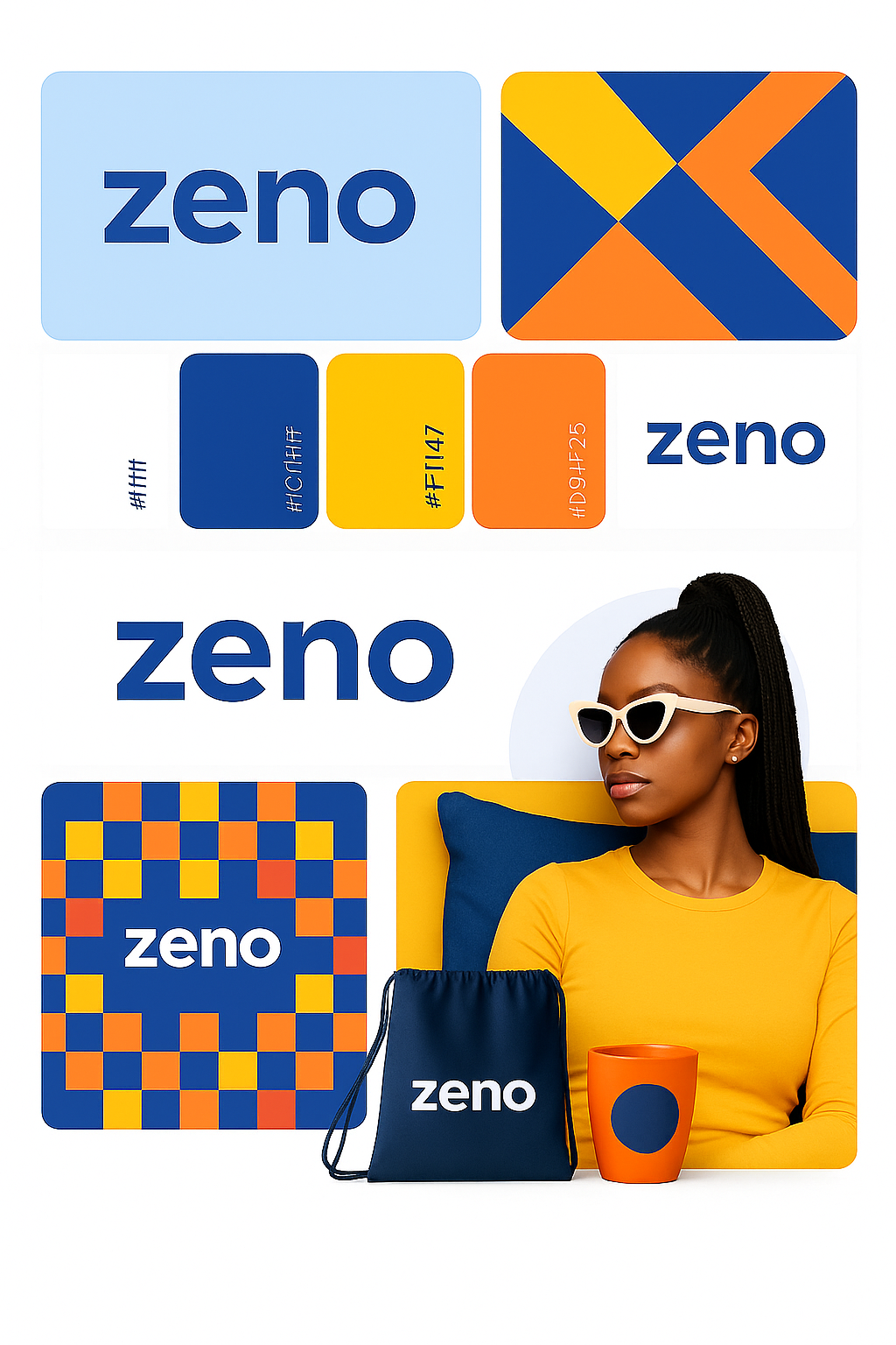 /Collection: /by davooda/Type: PNG/An eye-catching branding mockup showcasing the 'zeno' logo with vibrant colors, patterns, and stylish accessories, creating a modern and fresh aesthetic.
