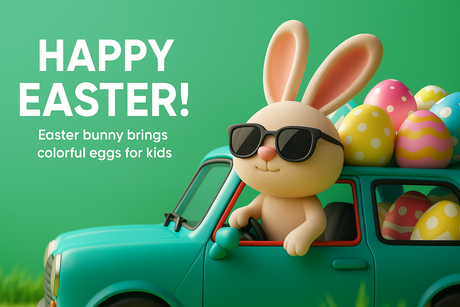 A charming Easter Bunny wearing sunglasses sits in a car filled with colorful Easter eggs. The vibrant green background enhances the festive mood.