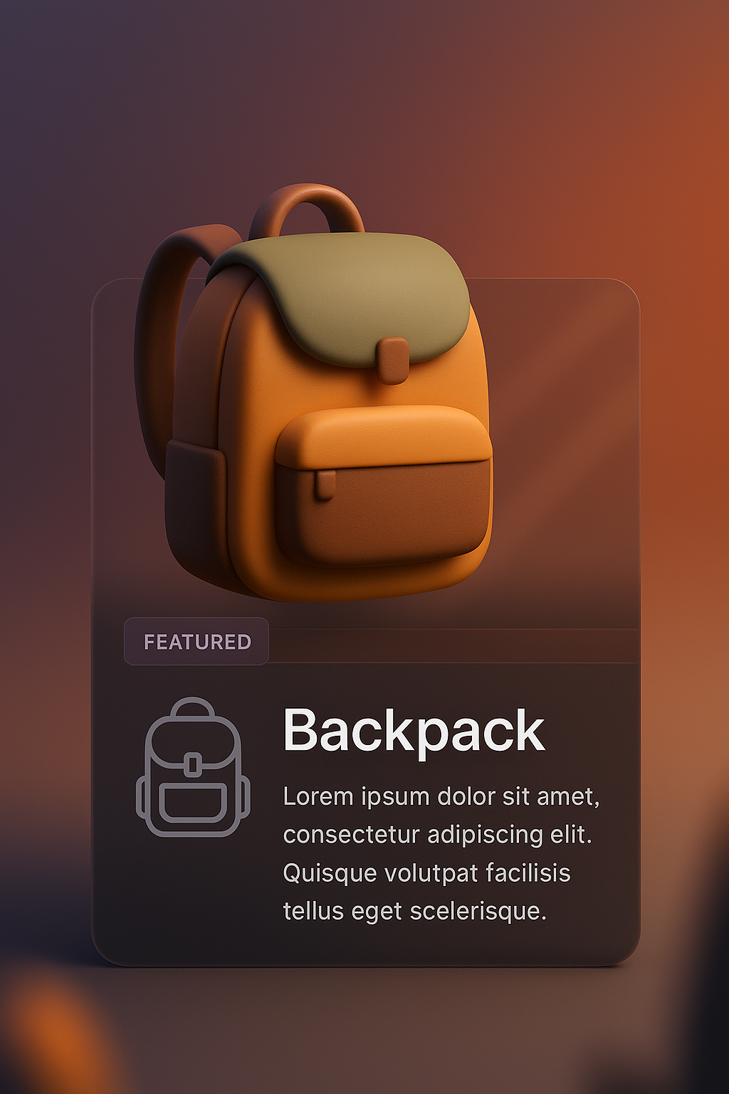 /Collection: /by davooda/Type: PNG/A 3D illustration of a backpack with a sleek design. The background features a smooth gradient, enhancing the visual appeal. Text overlay includes a featured label and description.