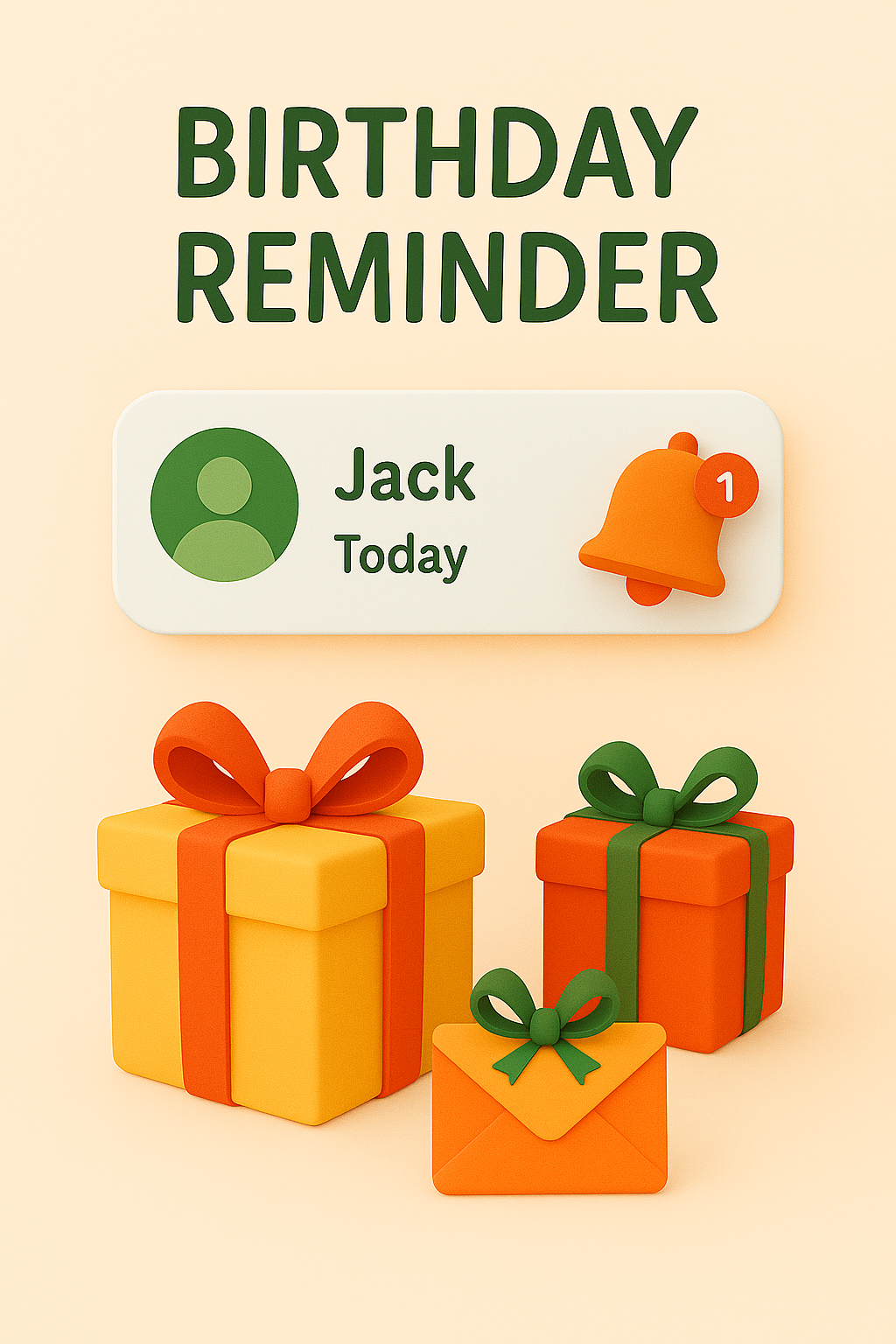 A vibrant and playful birthday reminder graphic featuring stylized gift boxes and a notification element, ideal for social media posts or event reminders.