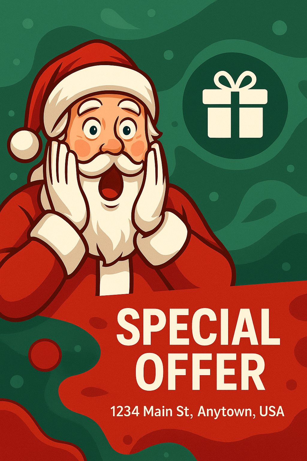 Cheerful promotional graphic depicting Santa Claus with a surprised expression, designed for holiday marketing. Vibrant colors and playful design elements create an engaging visual appeal.