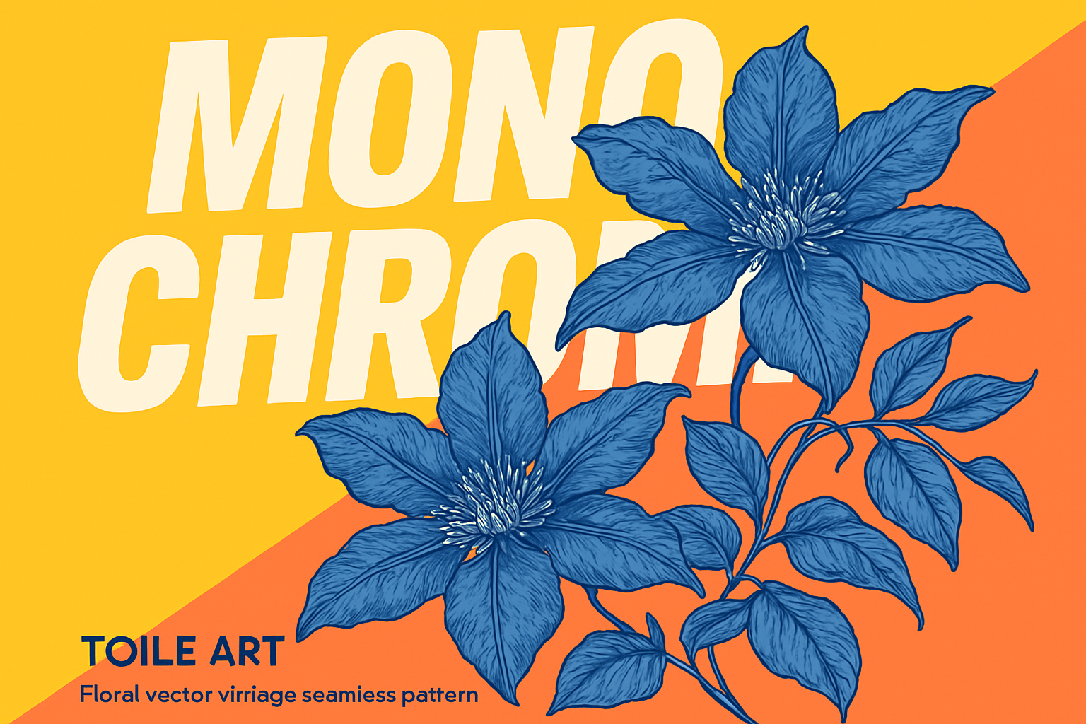 A vibrant vintage floral vector pattern featuring blue Clematis flowers on a beige background. Bold typography enhances the playful yet minimalistic design.