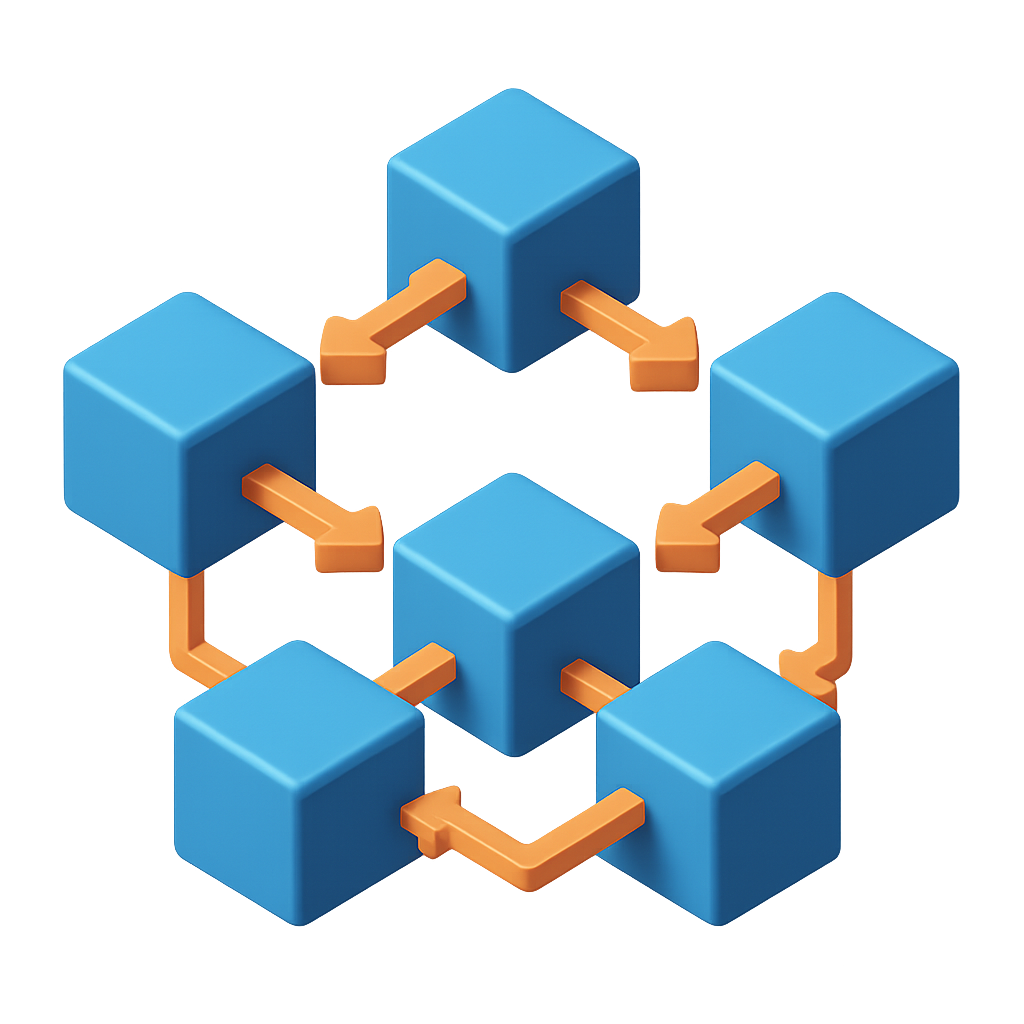 /Collection: /by davooda/Type: PNG/This image features a stylized 3D icon representing microservices architecture. It showcases interconnected blue cubes with orange arrows symbolizing data flow, set against a soft gradient background.
