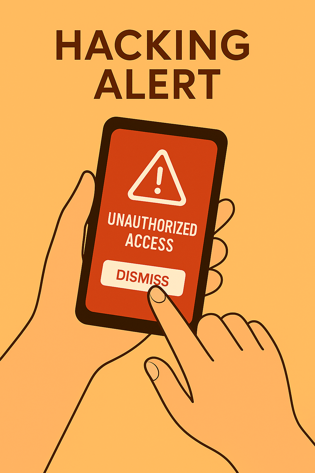 /Collection: /by davooda/Type: PNG/Illustrative graphic depicting a smartphone with a hacking alert notification. The design features a hand interacting with the screen, highlighting cybersecurity themes suitable for educational or awareness campaigns.