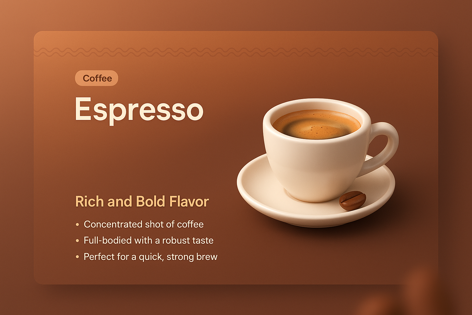 /Collection: /by davooda/Type: PNG/A 3D illustration of a coffee cup filled with espresso, set against a smooth gradient background. Features a clear title and bullet points highlighting the drink's rich flavor and characteristics.