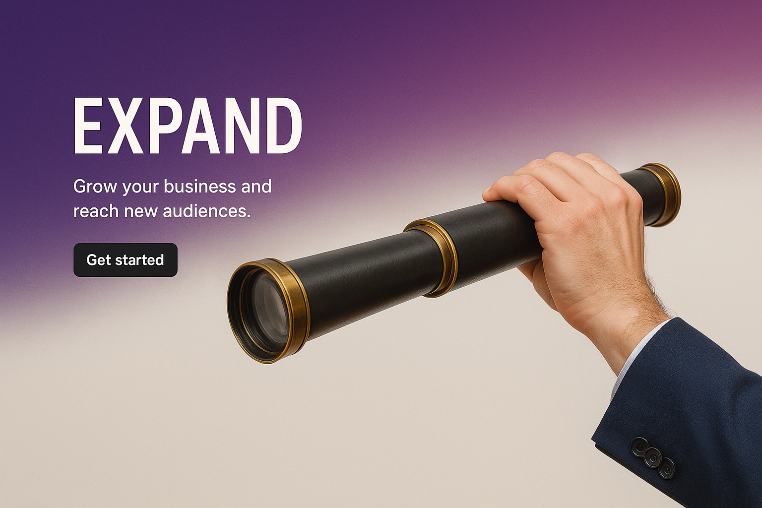 A sleek web design mockup featuring a hand holding a telescope, symbolizing business expansion. The gradient background transitions from dark to white, enhancing readability.
