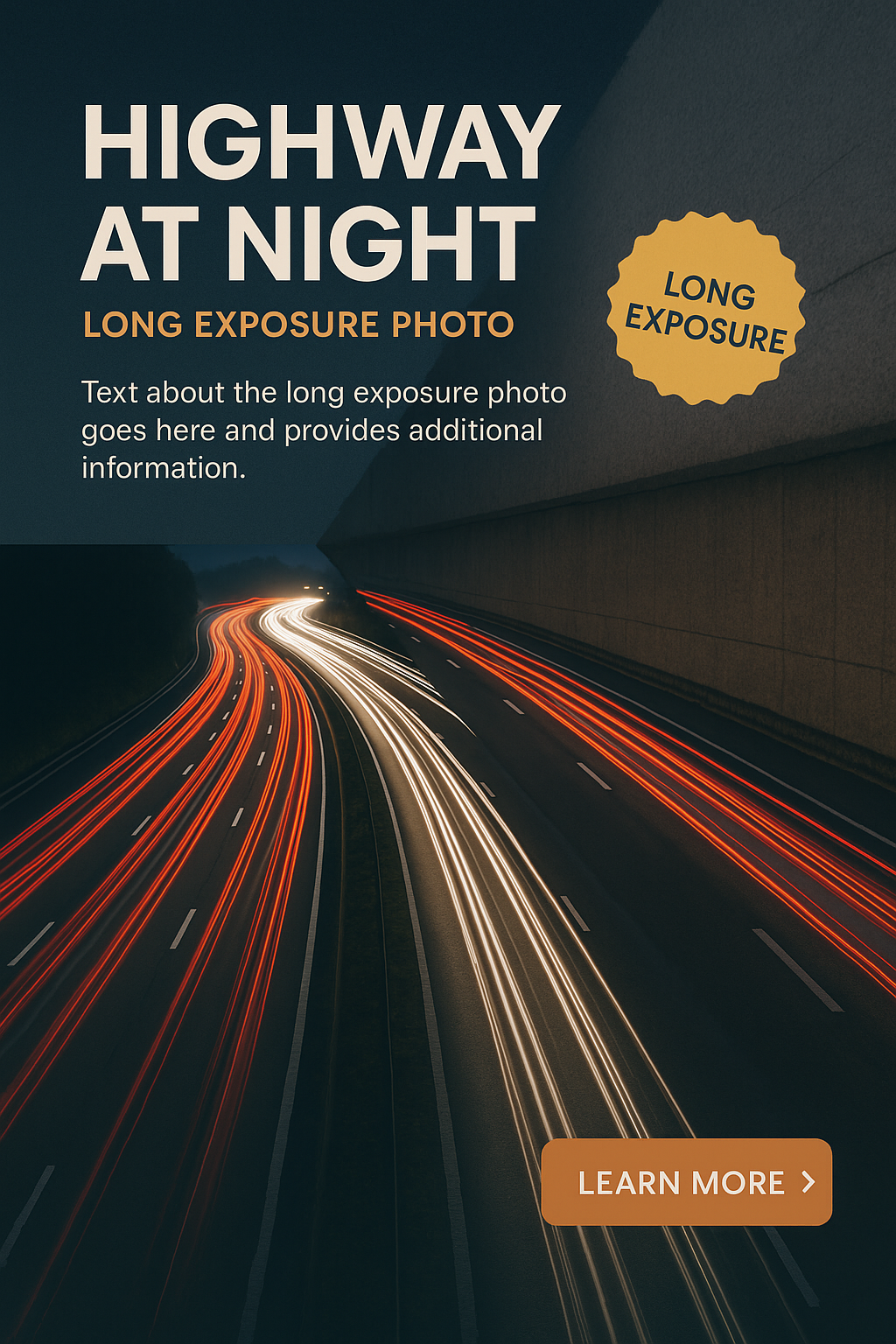 A captivating long exposure photograph showcasing a highway at night, with vibrant light trails and a professional layout. It features a balanced design with engaging text elements.